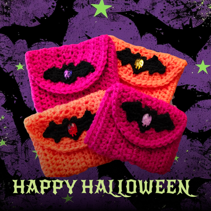 Petite pochette crocheté avec du fil acrylique dans des couleurs flashy. Applique chauve souris en fil de coton noir, cabochon en verre en forme de crâne. Fermeture aimanté