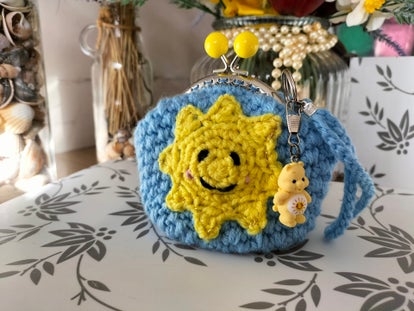 Grand porte monnaie crocheté avec amour sur le thème du soleil accompagné d'un bijoux de sac représentant un ourson jaune paré d'un soleil sur son bidou. Avis aux nostalgique des années 80 😉.