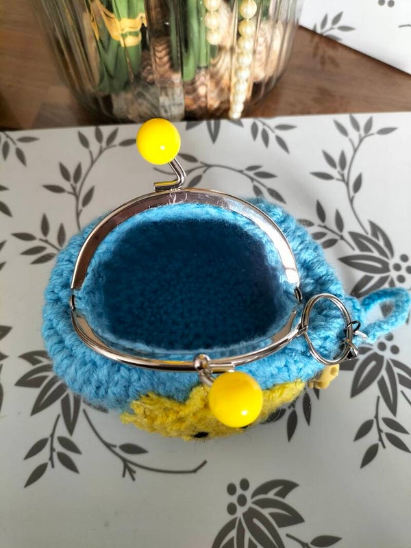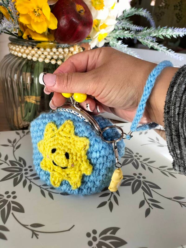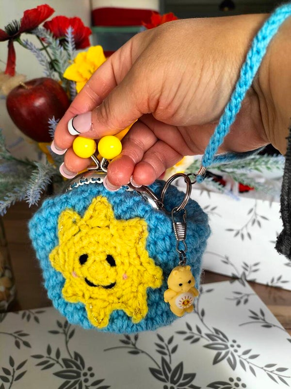 Grand porte monnaie crocheté avec amour sur le thème du soleil accompagné d'un bijoux de sac représentant un ourson jaune paré d'un soleil sur son bidou. Avis aux nostalgique des années 80 😉.