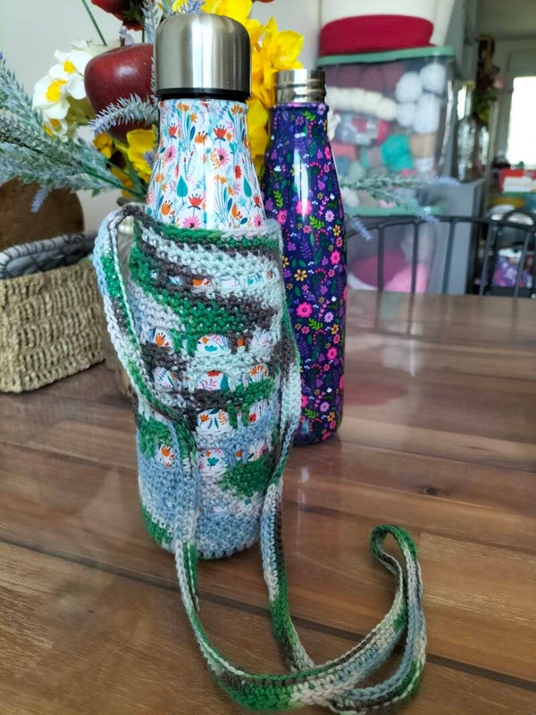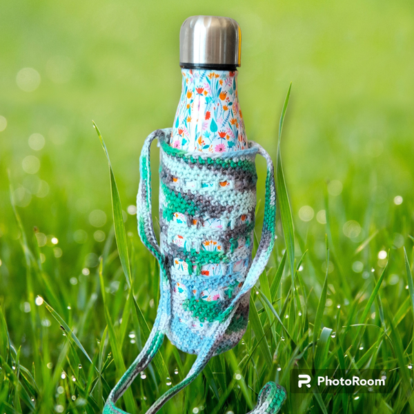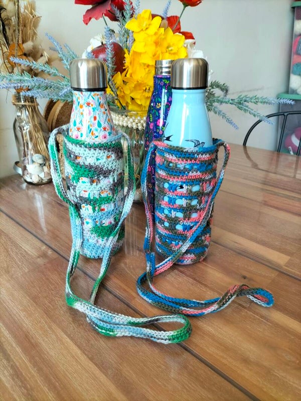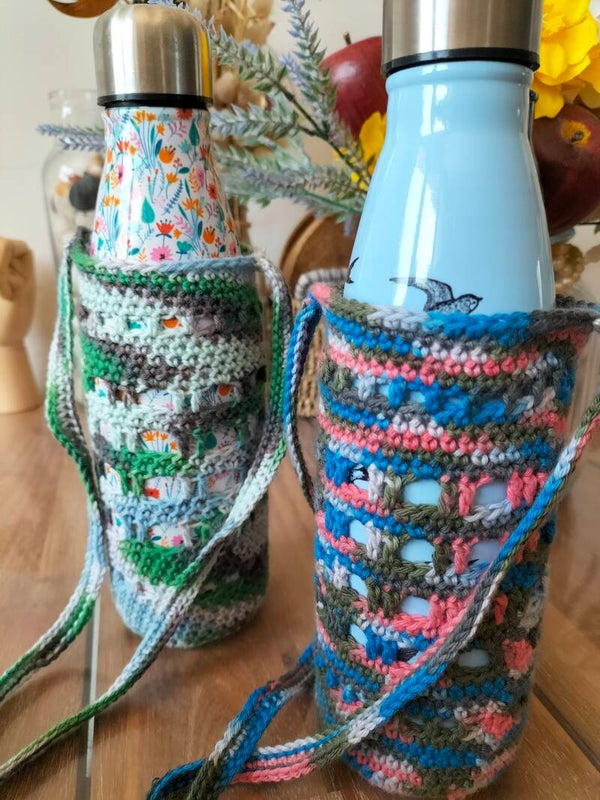 Jolis portes gourdes crocheté, idéal pour partir en balade sans s'encombrer d'un sac et les mains libres, de quoi se désaltérer direct à porté de mains.