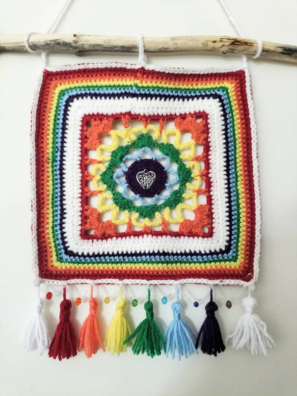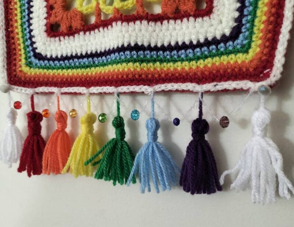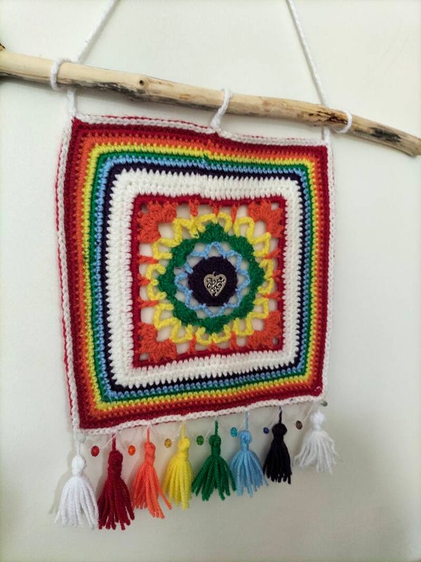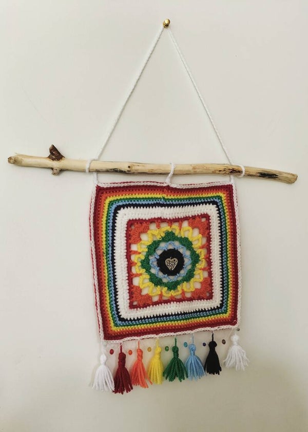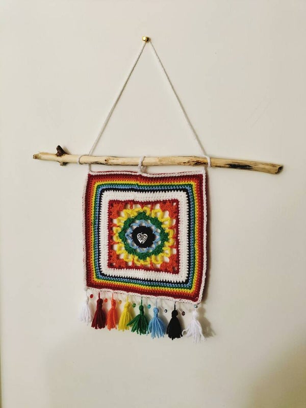 Suspension murale, dans l'esprit bohème et rétro, d'inspiration coloré en l'honneur de mois de la gay pride, on y retrouve forcément les couleurs du fameux drapeau arc-en-ciel 🌈.