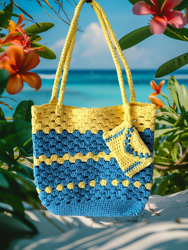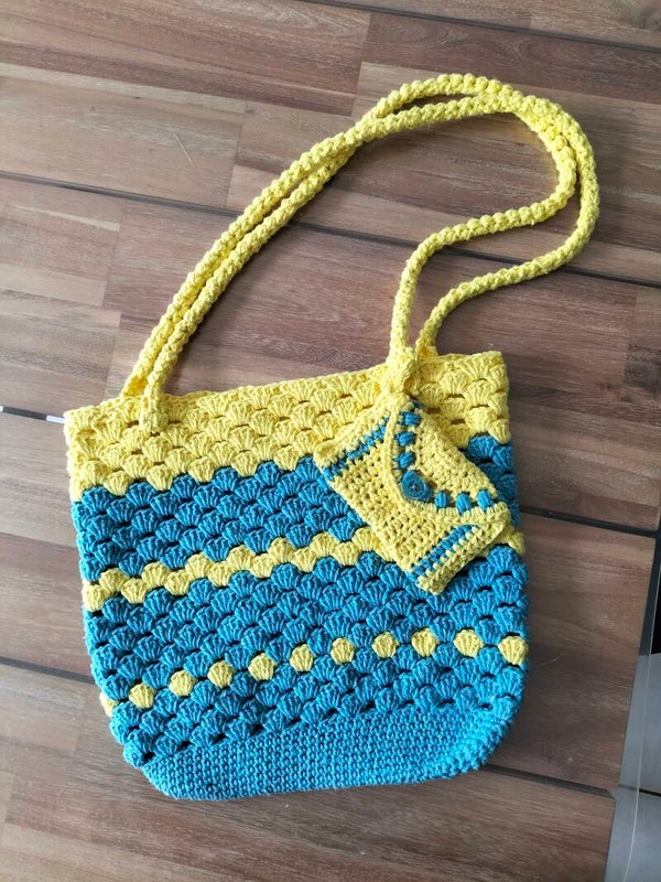 Sac cabas crocheté en point coquillage avec un fil de coton 100% recyclé, ce sac peut vous accompagné aussi bien en ville qu'à la plage...