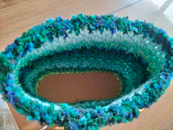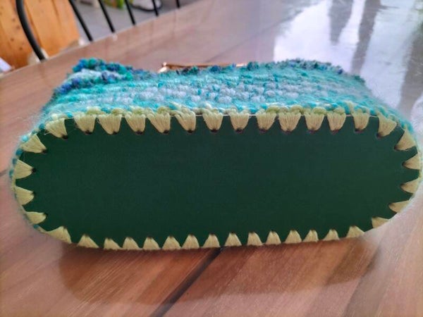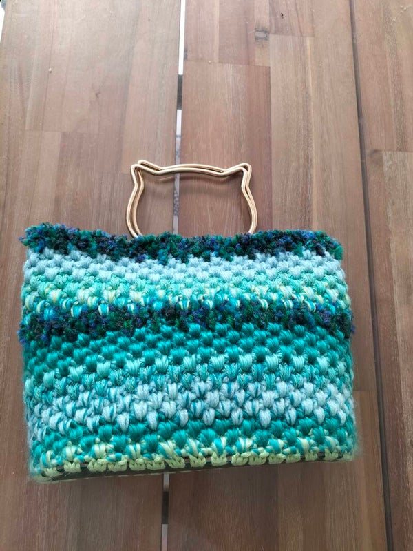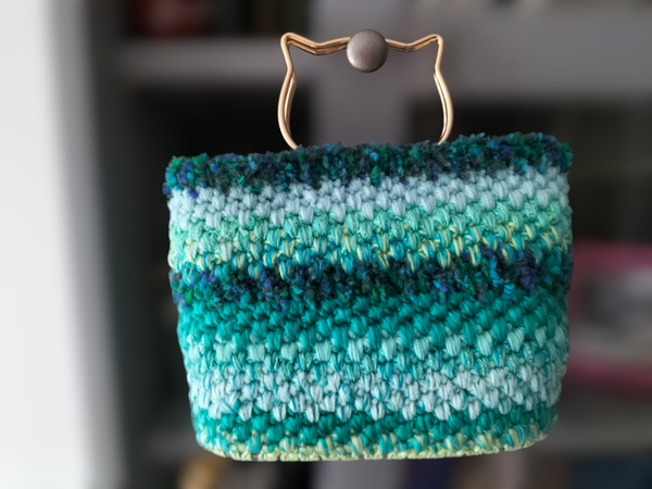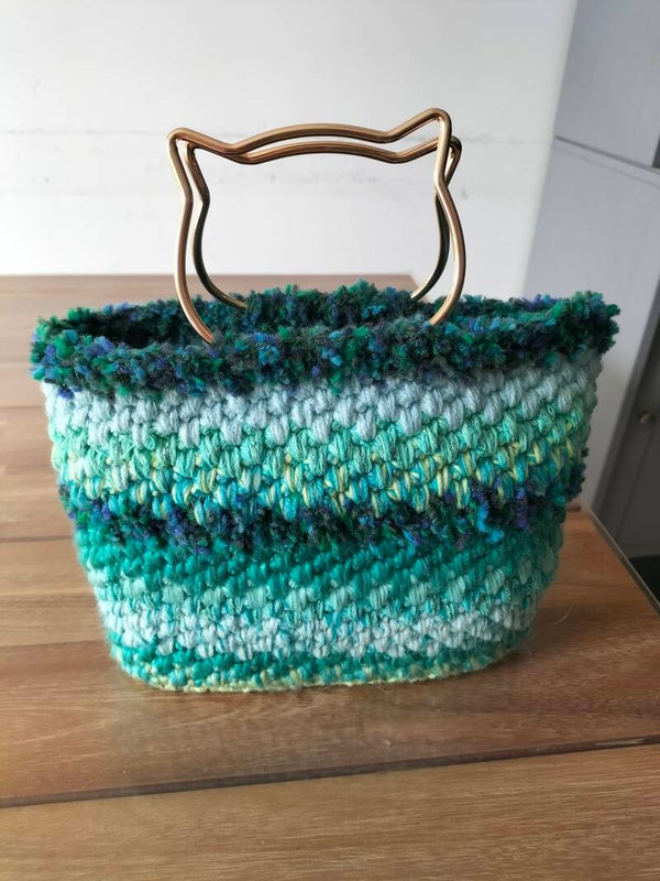 Ce joli sac a main, est entièrement crocheté avec des fins de pelotes, dans un camaïeu de vert, orné de jolies poignées dorées en forme de tête de chat.