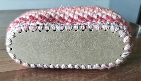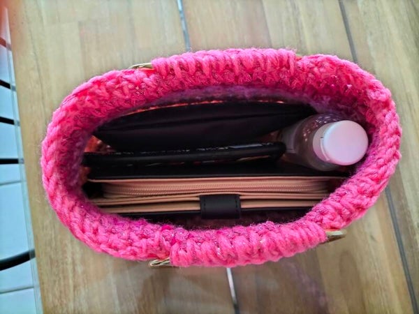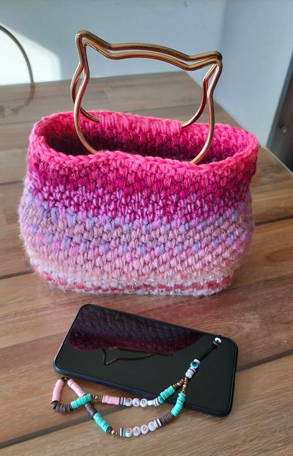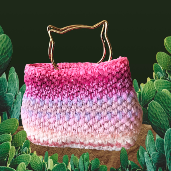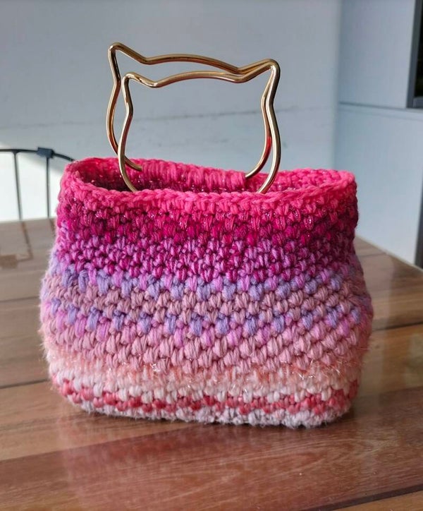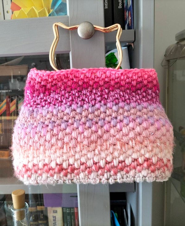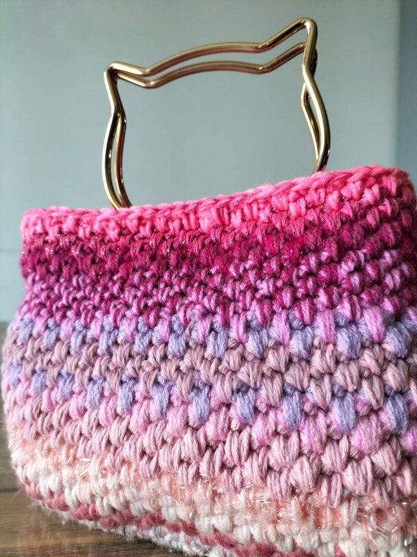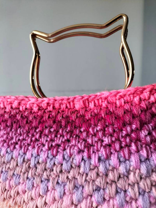 Ce joli sac a main, est entièrement crocheté avec des fins de pelotes, dans un camaïeu de roses, pêche et mauves, orné de jolies poignées dorées en forme de tête de chat.