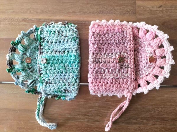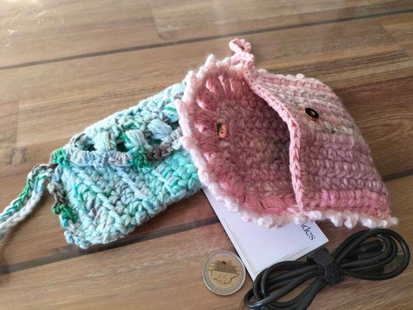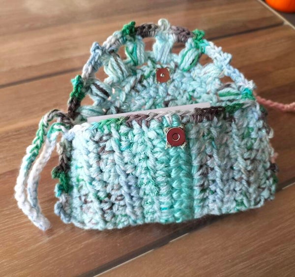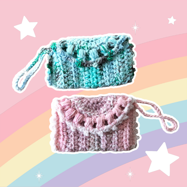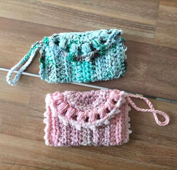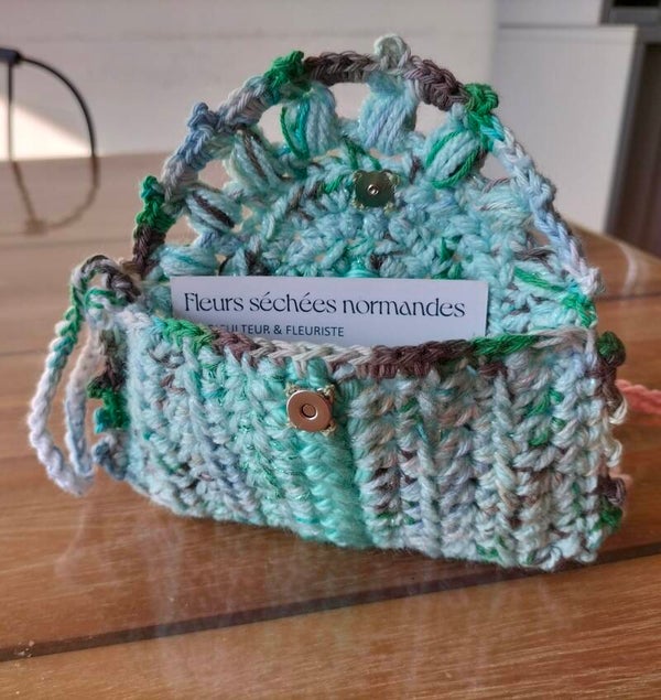 Crocheté avec des restes de pelotes, fermeture aimanté, chaque pochette est unique.