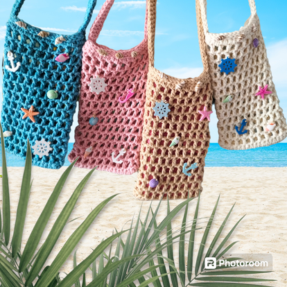 Dans un esprit marin, plage, vacances, ces jolis sacs sont crochetés en coton recyclé, brodé de breloques en bois et acrylique et de vrai coquillages .