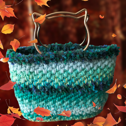 Ce joli sac a main, est entièrement crocheté avec des fins de pelotes, dans un camaïeu de vert, orné de jolies poignées dorées en forme de tête de chat.